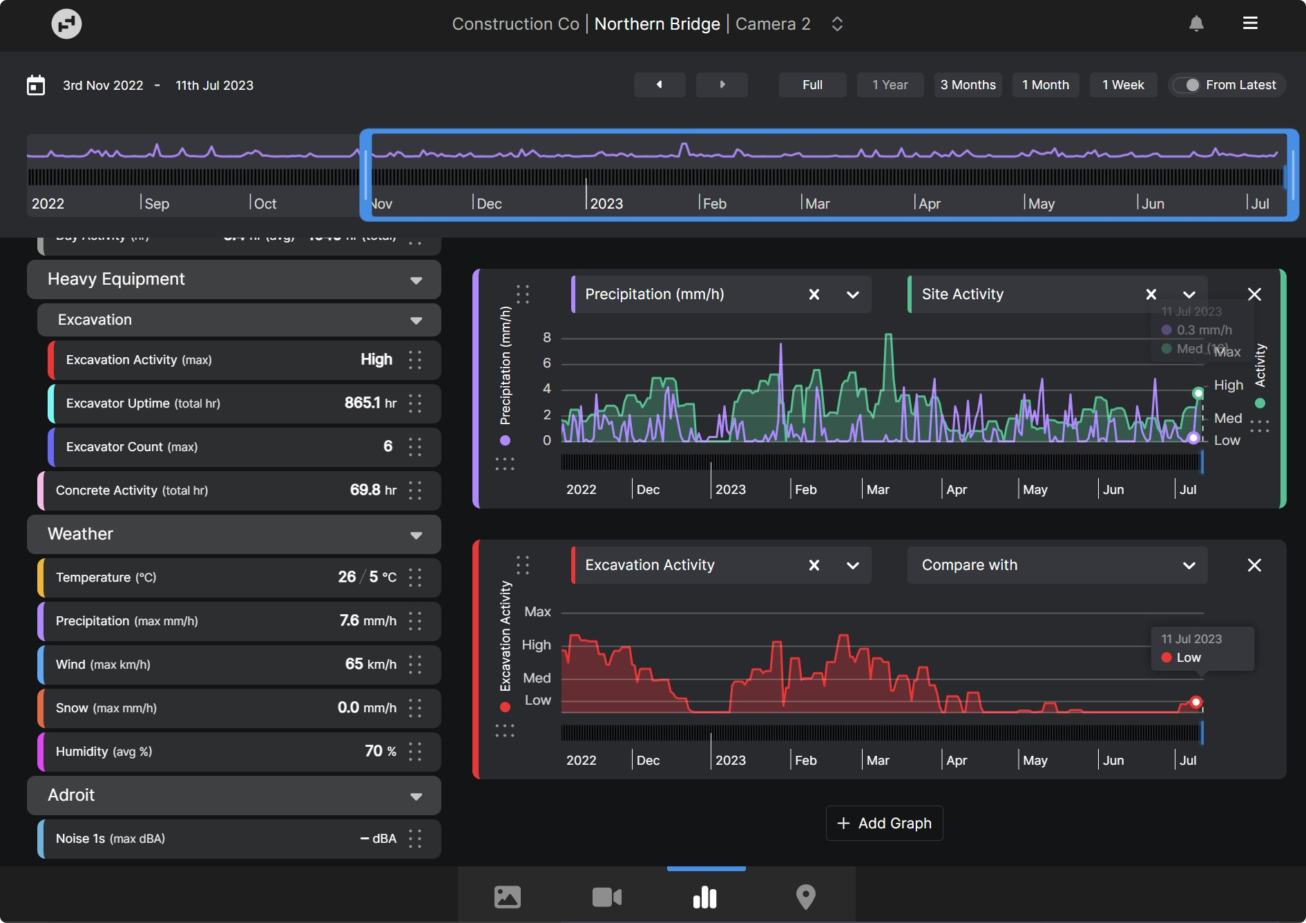 Audit personnel counts, concrete-truck delivery times, and plant and equipment activity for assets such as excavators, cranes, trucks and more. View historic weather records over the life of a project and create customized reports to demonstrate the impact on site activity, idle machinery, rescheduled concrete pours, and more. You’ll have the irrefutable visual evidence you need to resolve dispute claims quickly.